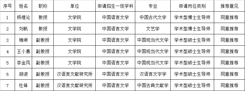 依据《伟德BV1946官网学术型研究生指导教师岗位审核管理办法》(西校〔2016〕424号)、《伟德BV1946官网加强研究生导师立德树人职责的实施办法》(西委〔2018〕73号)和研究生院《关于开展2019年首次申请学术型研究生指导教师岗位审核工作的通知》要求,中国语言文学学术委员会于11月8日召开学术委员会会议,根据申请人在该学科领域的学术成果、学术水平、科学研究能力等相关申请材料,进行综合评议,现将审核结果公示如下: