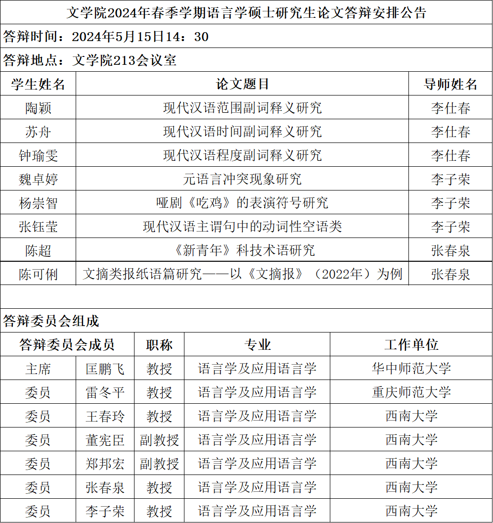 2024年春季学期语言学及应用语言学专业硕士学位论文答辩安排公告