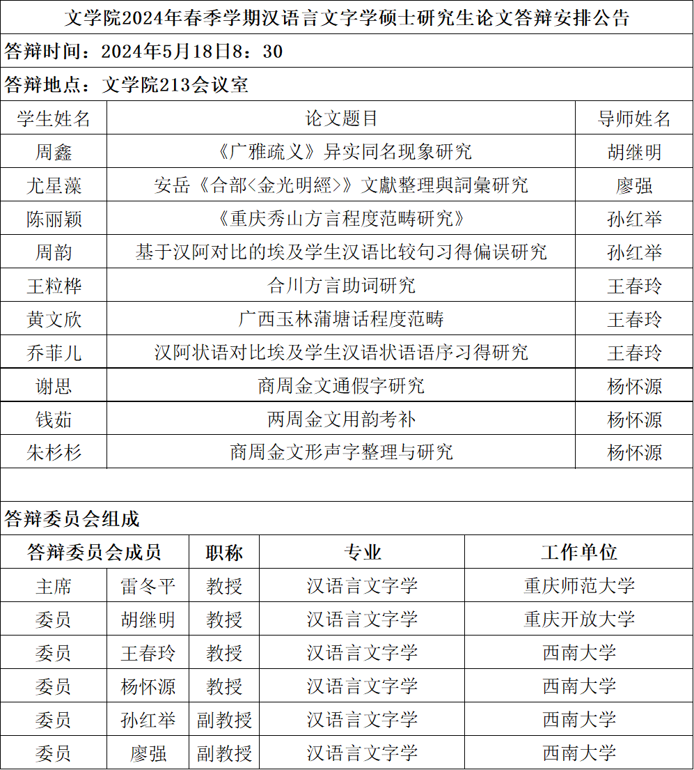 2024年春季学期汉语言文字学专业硕士学位论文答辩安排公告