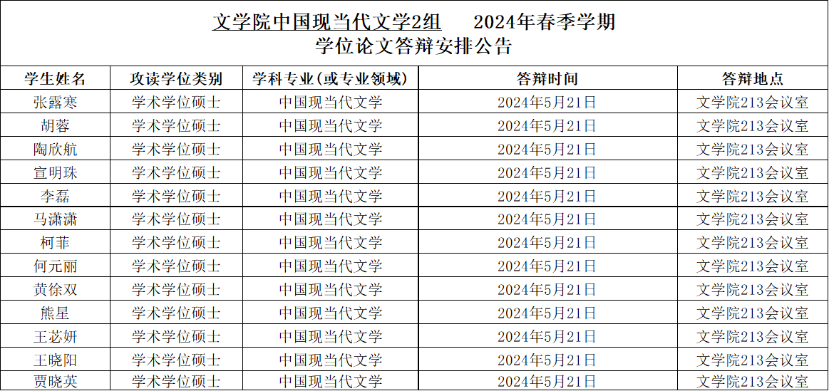 2024年春季学期中国现当代文学专业硕士学位论文答辩安排公告