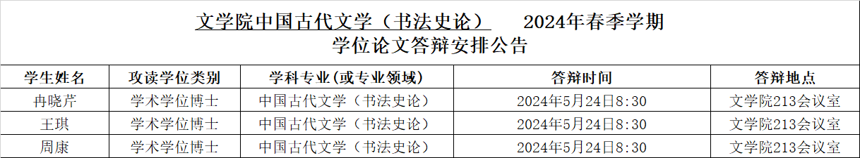 2024年春季学期中国古代文学(书法史论)专业博士学位论文答辩安排公告