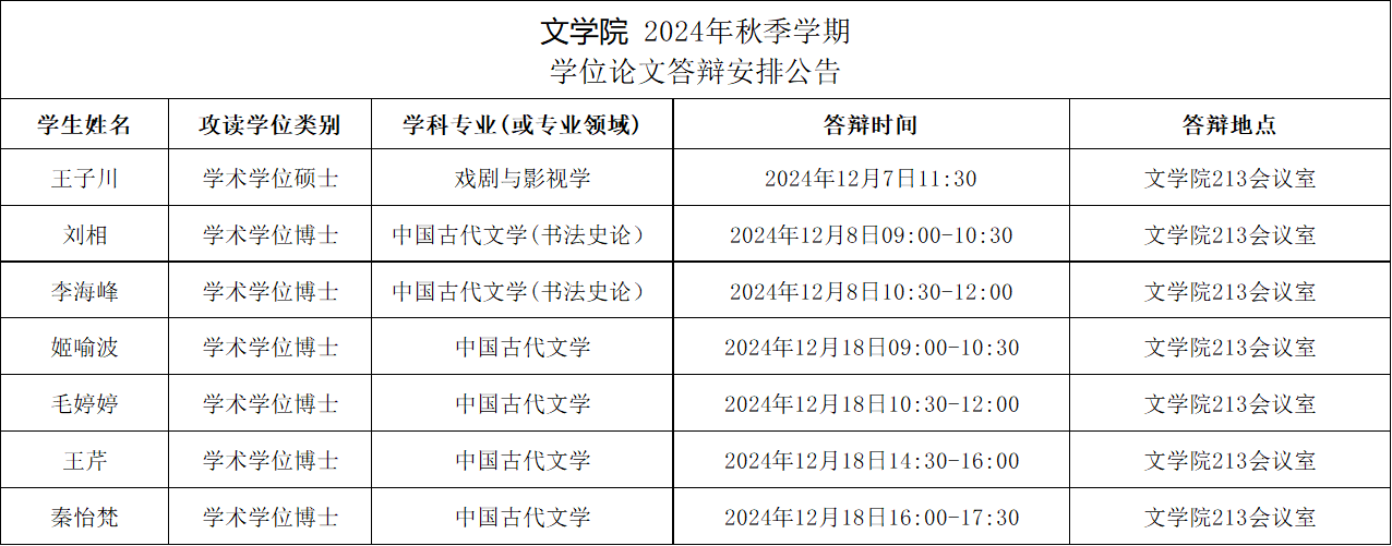 2024年秋季学期研究生学位论文答辩公告