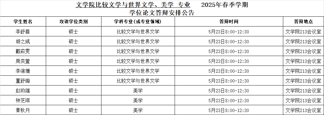 伟德国际1946比较文学与世界文学、美学专业2025年春季学期学位论文答辩安排公告