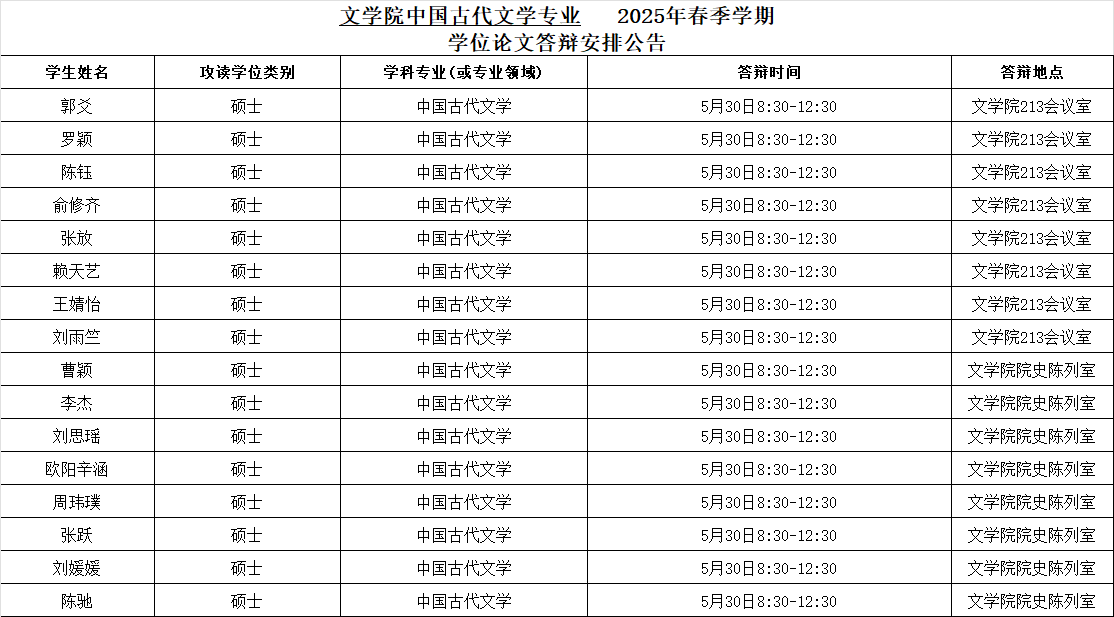 伟德国际1946中国古代文学专业2025年春季学期学位论文答辩安排公告