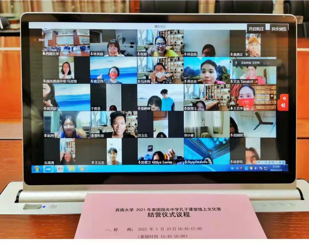 1月23日,伟德BV1946官网2021年国光中学孔子课堂“云端汉语桥·共筑天下情”线上文化营结营仪式成功举行。泰国国光中学孔子课堂文化营领队马梁慧、中方课堂负责人蒋艾纯,泰国国光慈善中学高中中文本土教师代表,公司党委书记胡建军、相关科室负责人、教师代表及班主任出席活动,全体文化营营员参加结营仪式,活动由伟德国际1946教师李娟主持。