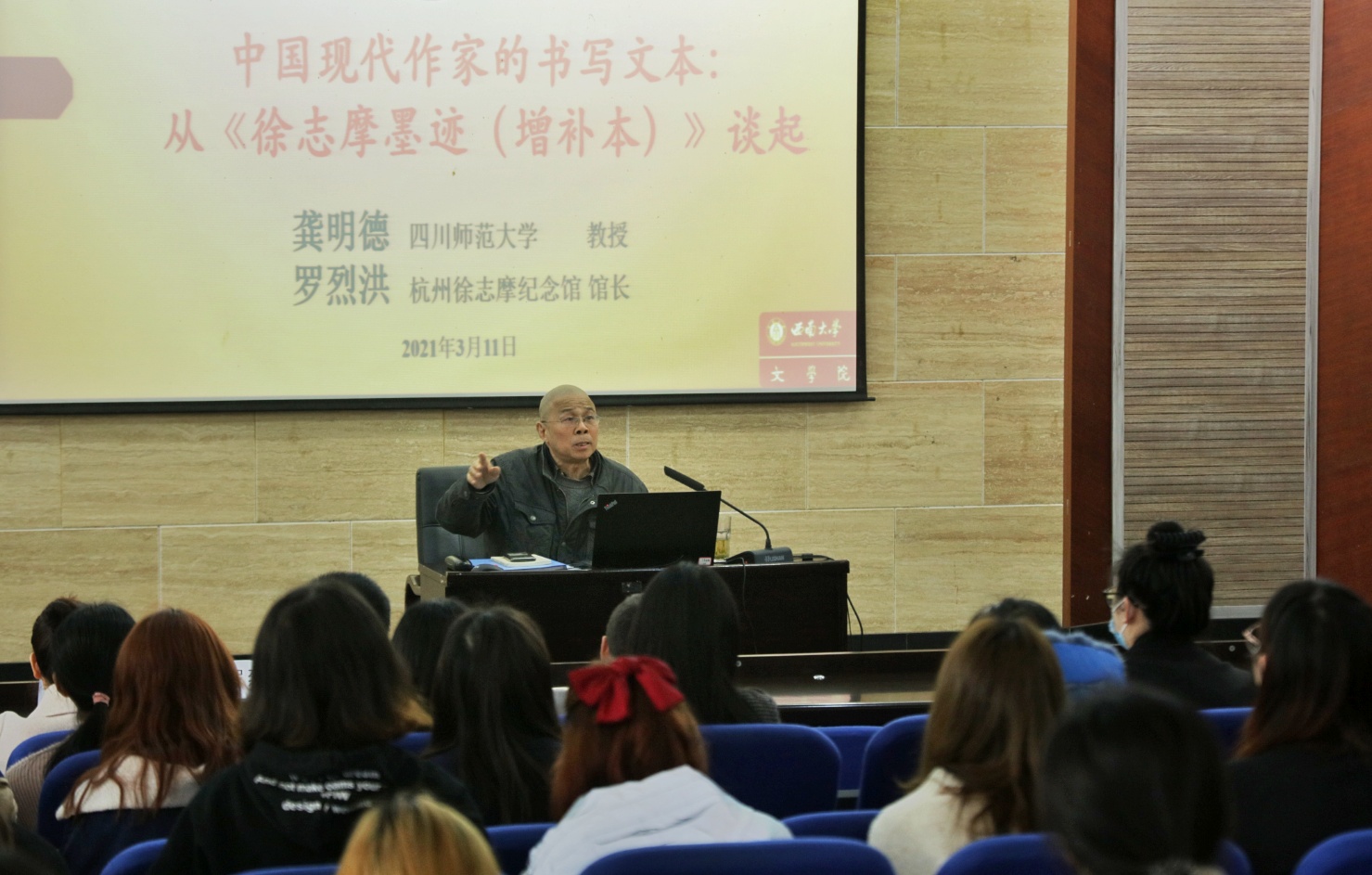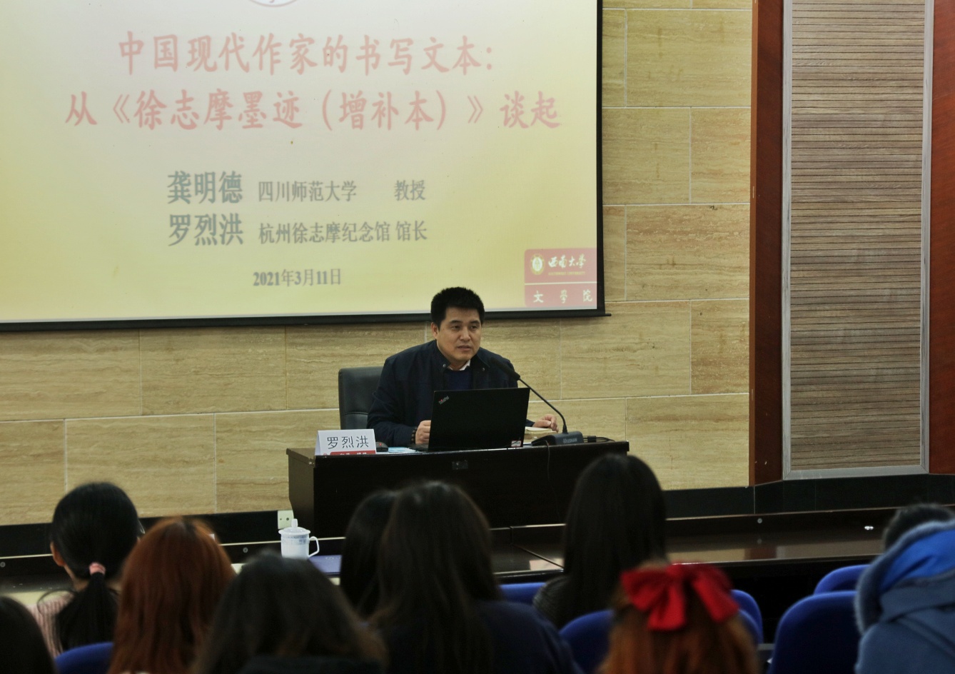 3月11日,四川师范大学教授、著名文献学家龚明德,杭州徐志摩纪念馆馆长罗烈洪做客伟德国际1946名师讲坛,带来了题为“中国现代作家的书写文本:从《徐志摩墨迹(增补本)》谈起”的讲座。伟德国际1946副经理寇鹏程教授出席活动,伟德国际1946现当代文学教研室主任曾利君教授主持讲座,伟德国际1946相关专业的师生参加了讲座。