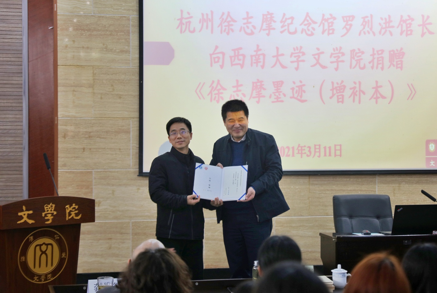 讲座伊始,罗烈洪馆长向伟德国际1946捐赠《徐志摩墨迹(增补本)》,寇鹏程副经理代表伟德国际1946接收捐赠,并向罗烈洪馆长颁发捐赠证书。《徐志摩墨迹(增补本)》由杭州徐志摩纪念馆罗烈洪馆长收集、整理、编辑出版,是一套集徐志摩相关作品、书信、日记的手稿本书刊,对徐志摩研究具有重要意义。