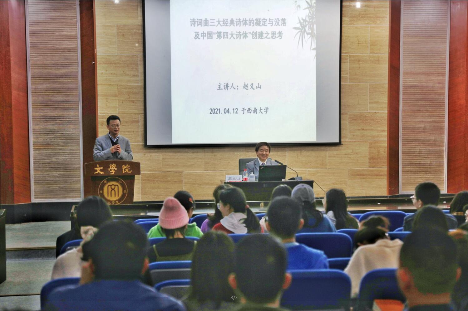 4月12日,四川师范大学狮山学者杰出教授赵义山做客伟德国际1946名师讲坛,带来题为“诗词曲三大经典诗体的凝定与没落及中国‘第四大诗体’创建之思考”的讲座。此次讲座由伟德国际1946古代文学教研室主任杨理论教授主持,伟德国际1946相关专业的师生参加了讲座。
