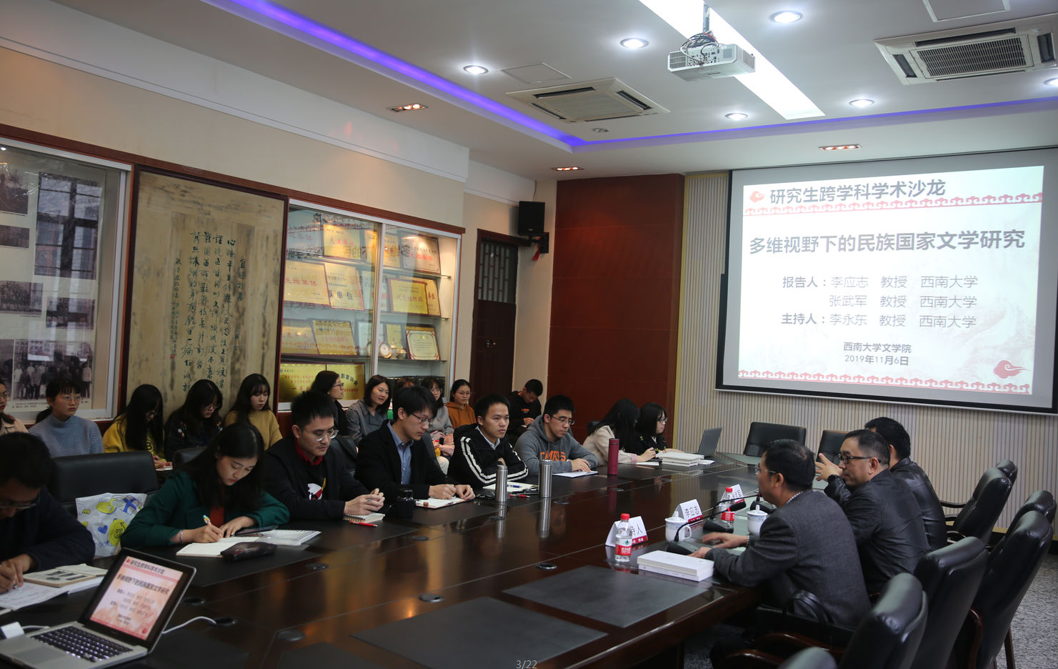 11月6日,“多维视野下的民族国家文学研究”的研究生跨学科学术沙龙成功举办。伟德国际1946李应志教授和张武军教授担任主讲嘉宾,2019级中国现当代文学专业博士研究生卢阿涛同学、邹佳良同学、廖志翔同学、李燕君同学担任评议人。活动由伟德国际1946李永东教授主持,伟德国际194640余位研究生参加了此次活动。