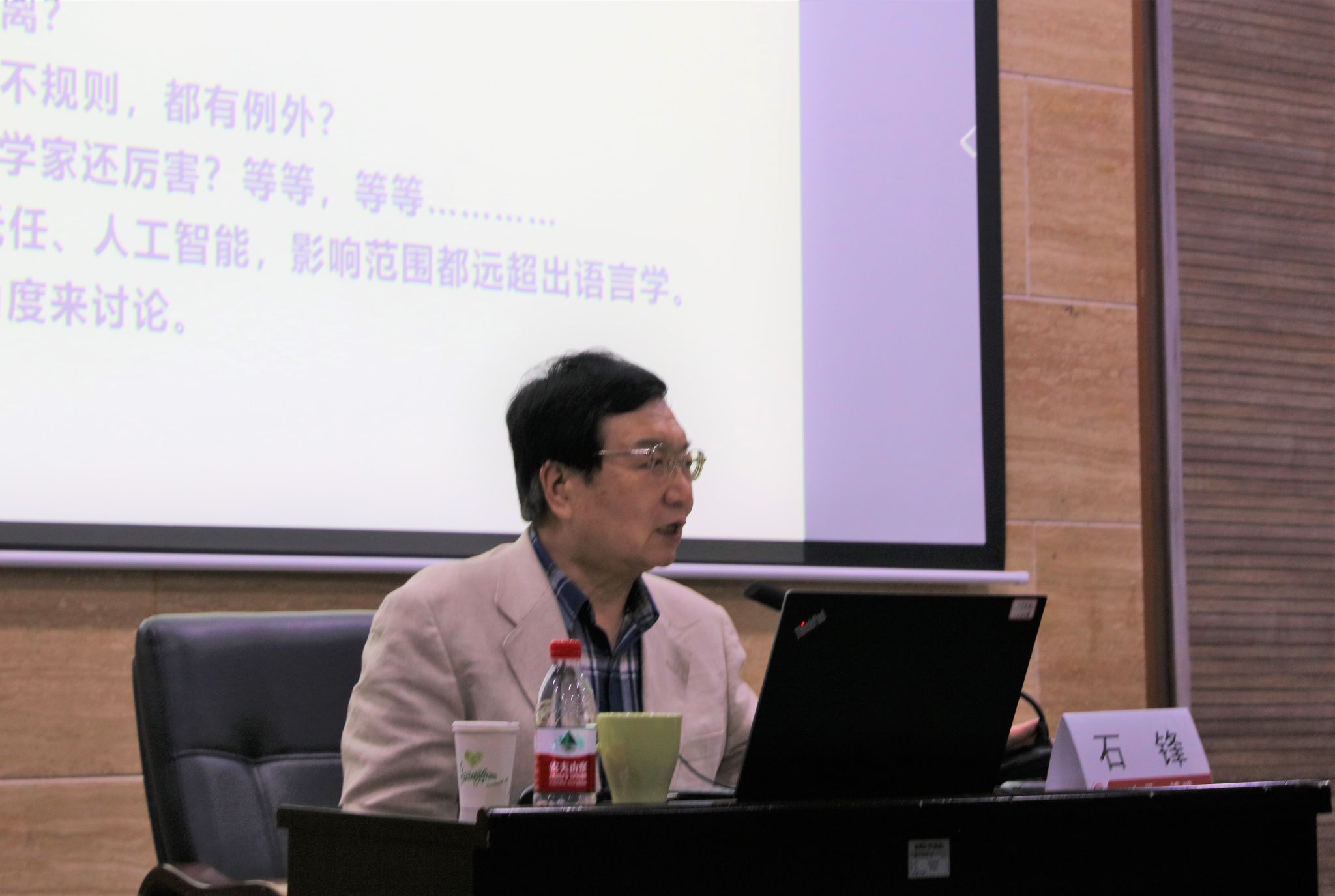 石锋教授从ChatGPT引起的一系列语言学相关问题谈起,从连续统思维、原型范畴理论、量子逻辑的含中律、多能性经典等方面对赵元任的连续统思维进行了全面介绍,对王士元的词汇扩散论进行了总结,从其他物种的运作方式、儿童语言习得、成人二语习得等方面的实验数据展示了拉波夫的概率匹配法则,从生成语法的发展历程、优选论和与时俱进的发展观等方面对乔姆斯基的生成语法进行介绍。石锋教授分享了对语言的起源、约定俗成论、语言与思维的关系、动物的语言等语言学基本问题的思考,阐释了人工智能的利弊。他指出,人工智能只是人类使用的工具,当代学子应跳出理论,走向实践,注重实验语言学的发展,助推中国语言学高质量发展。