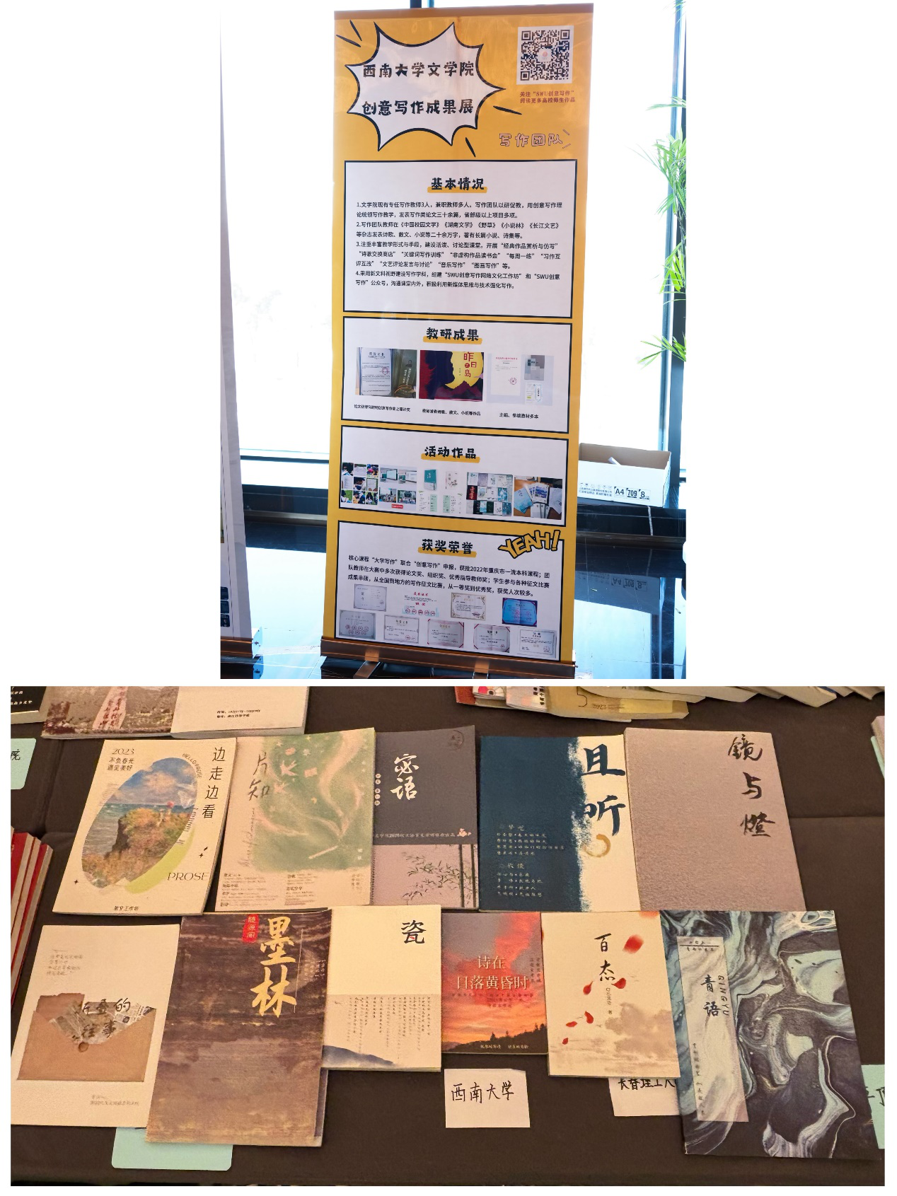 另外,本届大会在线下场地专门搭建了“创意写作成果展”的展台,集中展示了近年来创意写作的相关成果。伟德国际1946创意写作团队利用海报和实物的形式宣传伟德国际1946创意写作的基本情况、教研成果、活动作品和荣誉奖项等,吸引了诸多专家学者驻足观赏。