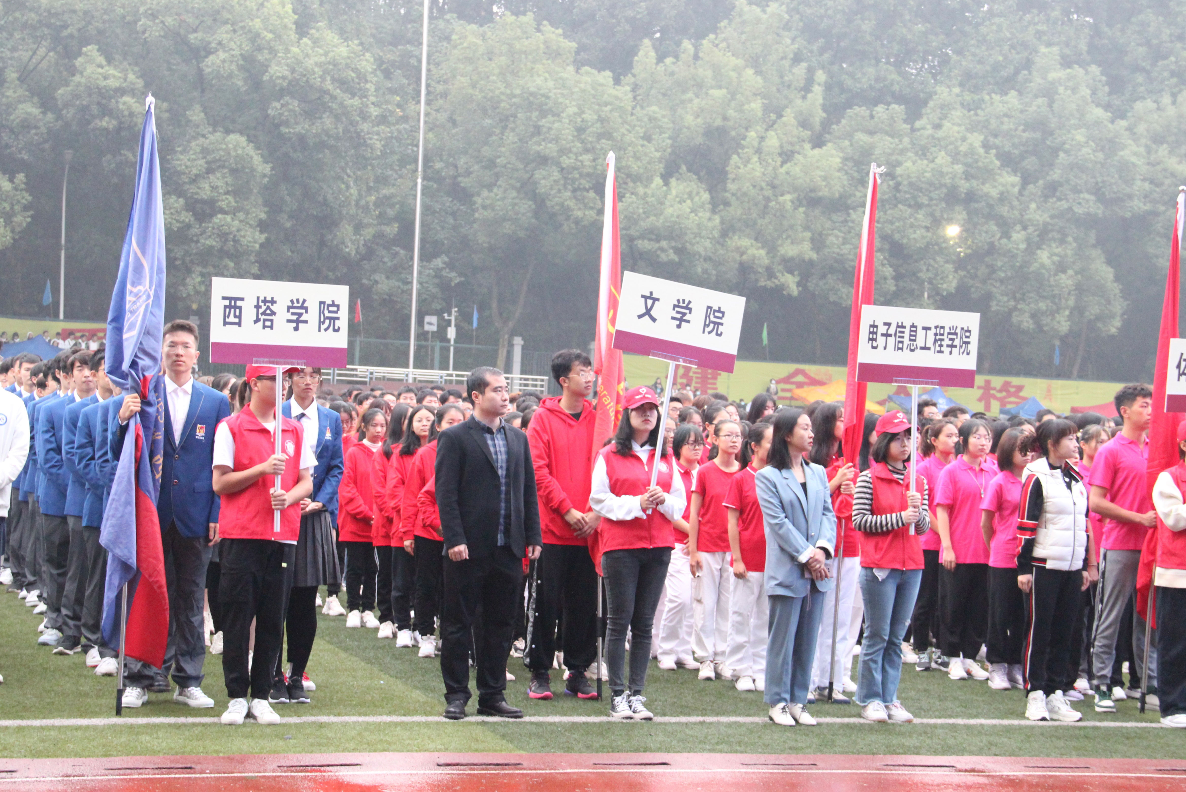 运动会开幕式在第一运动场举行。升旗仪式后,公司党委副书记、校体委主任潘洵致辞,强调身心健康、体魄强健的重要意义,希望同学们赛出友谊、赛出水平、赛出风格。董事长张卫国宣布运动会开幕。