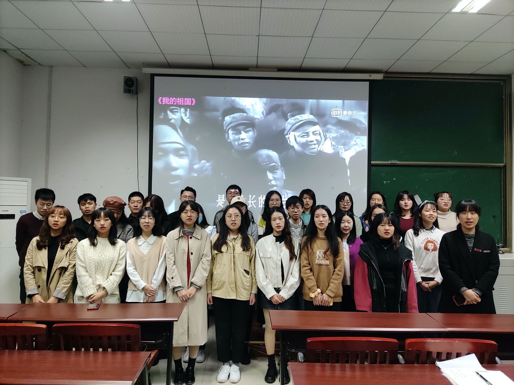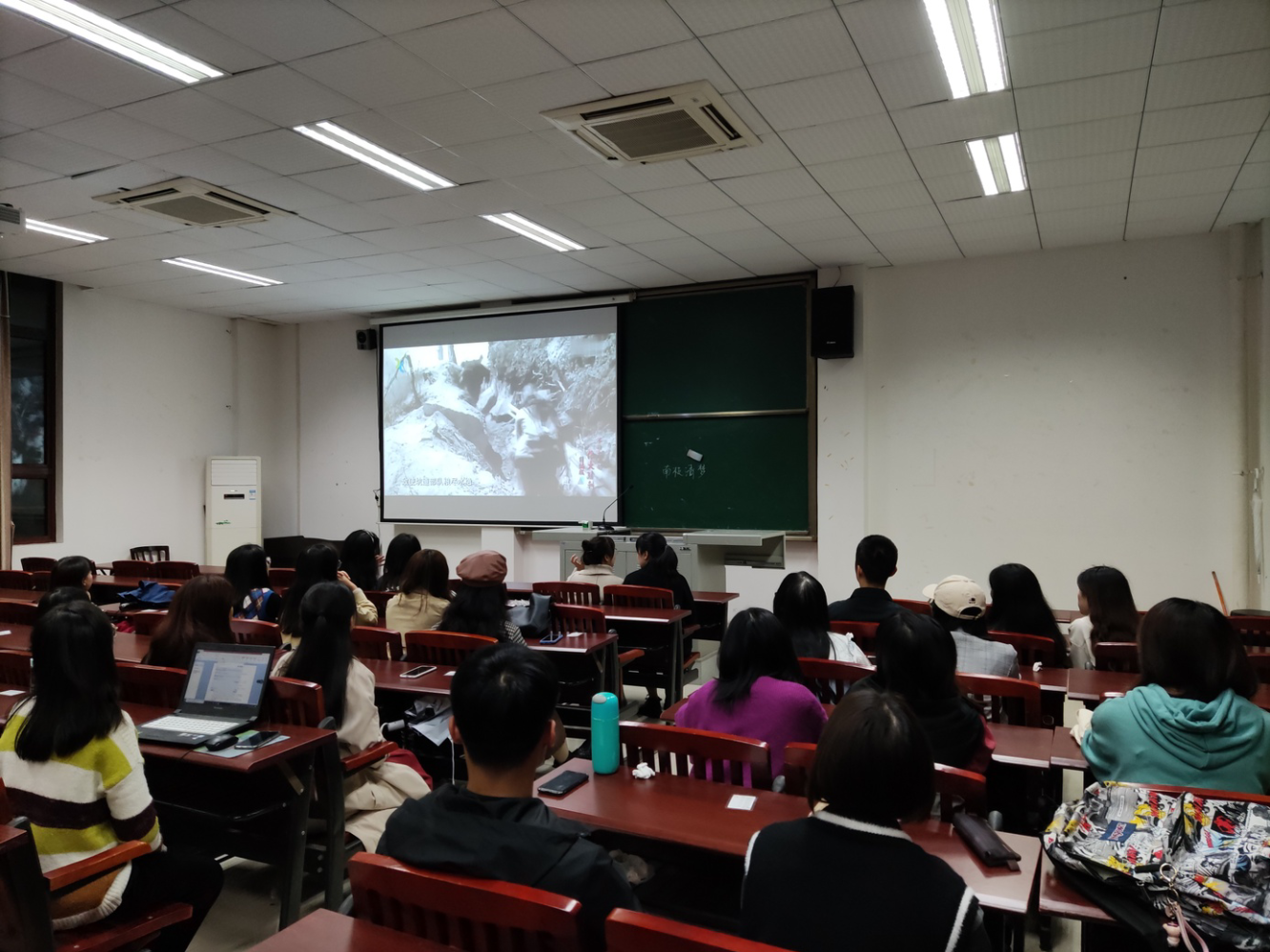 活动从观看纪录片《不能忘却的伟大胜利》开始,该纪录片讲述了抗美援朝过程中在后勤运输不断被敌人轰炸、毁坏的情况下,后勤兵冒着生命危险运输抗战物资的故事,志愿军不怕牺牲、决不放弃的精神使得在场同学深受感动。观影过后,同学们齐声合唱《我的祖国》,现场气氛庄严肃穆。活动最后,陈玥副书记总结指出,现在的美好生活来之不易,同学们应该坚定理想信念,弘扬抗美援朝精神,勇担历史使命,为中华民族的伟大复兴而不懈奋斗。