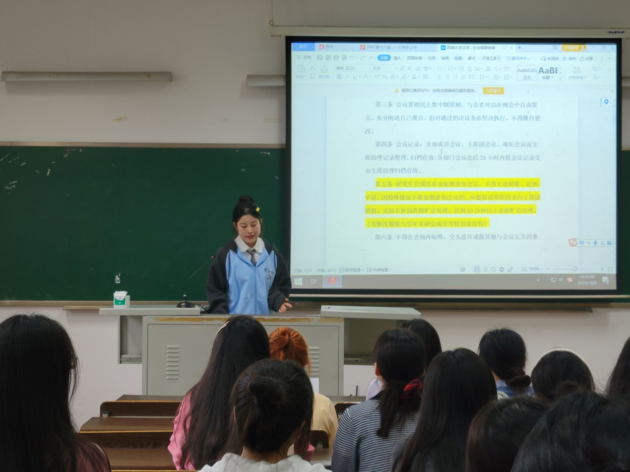 工作例会上,刘凯丽代表研究生会全体成员向各部门新成员表示热烈欢迎,表达了对未来工作的美好展望。在主席团成员带头的自我介绍环节里,各部门成员围绕兴趣爱好等方面介绍自己,表达了与研会各成员共同成长进步的期待。
