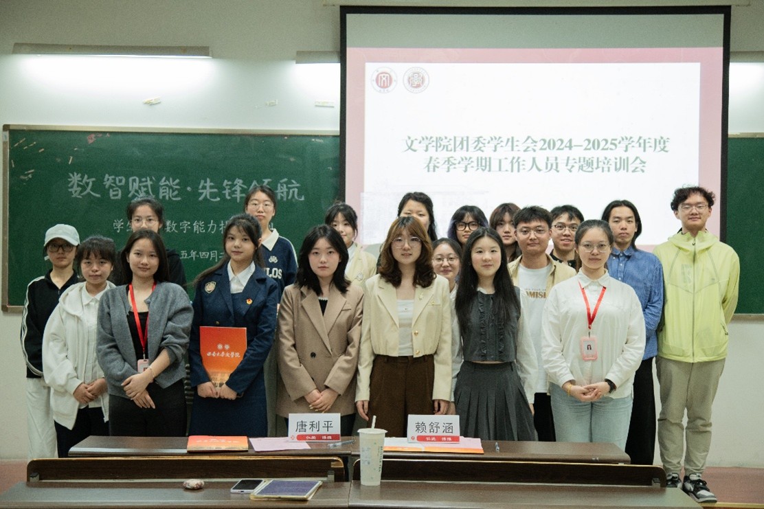 会议伊始,赖舒涵老师主讲“AI赋能求职全流程的场景运用”,从自身的求职经验出发,内容涵盖简历制作、面试准备等多个求职环节中AI的应用技巧与方法。接着,团委书记唐利平从AI的本质是什么、数字能力提升的重要性、AI能否替代文学三个方面进行总结讲话,并强调在运用AI工具时要保持深度思考的能力,彰显人文精神。