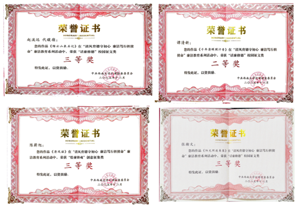 公司选送作品紧扣廉洁主题,构思新颖、内涵丰富,展现了对廉洁文化的深刻理解。经公司评审,谭清新同学作品《千年清晖照汗青》荣获征文类二等奖,张瀚文同学作品《阳光照进角落》、赵溪远同学作品《缙云山泉石记》荣获征文类三等奖,陈薪旭同学作品《清风谣》荣获创意征集类三等奖。