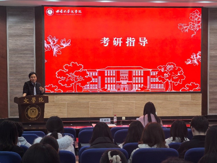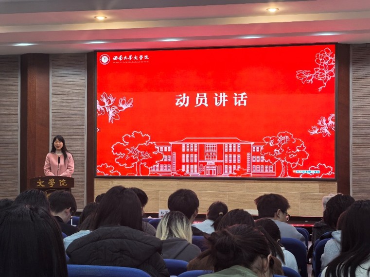 随后,2025届汉语言文字学专业陈红志同学作为往届考研代表,结合自身经历作经验分享。她从院校选择、时间规划、分科备考等方面系统梳理了备考要点,建议同学们尽早确定目标、合理分配时间、善用网络资源,保持平稳心态。最后,2027届考研员工代表何彦蓉同学分享备考心路。她号召同学们不惧迷茫焦虑,在每一个疲惫时刻仍能翻开书本、继续前行,以中文人特有的理想与坚韧迎接这场挑战。