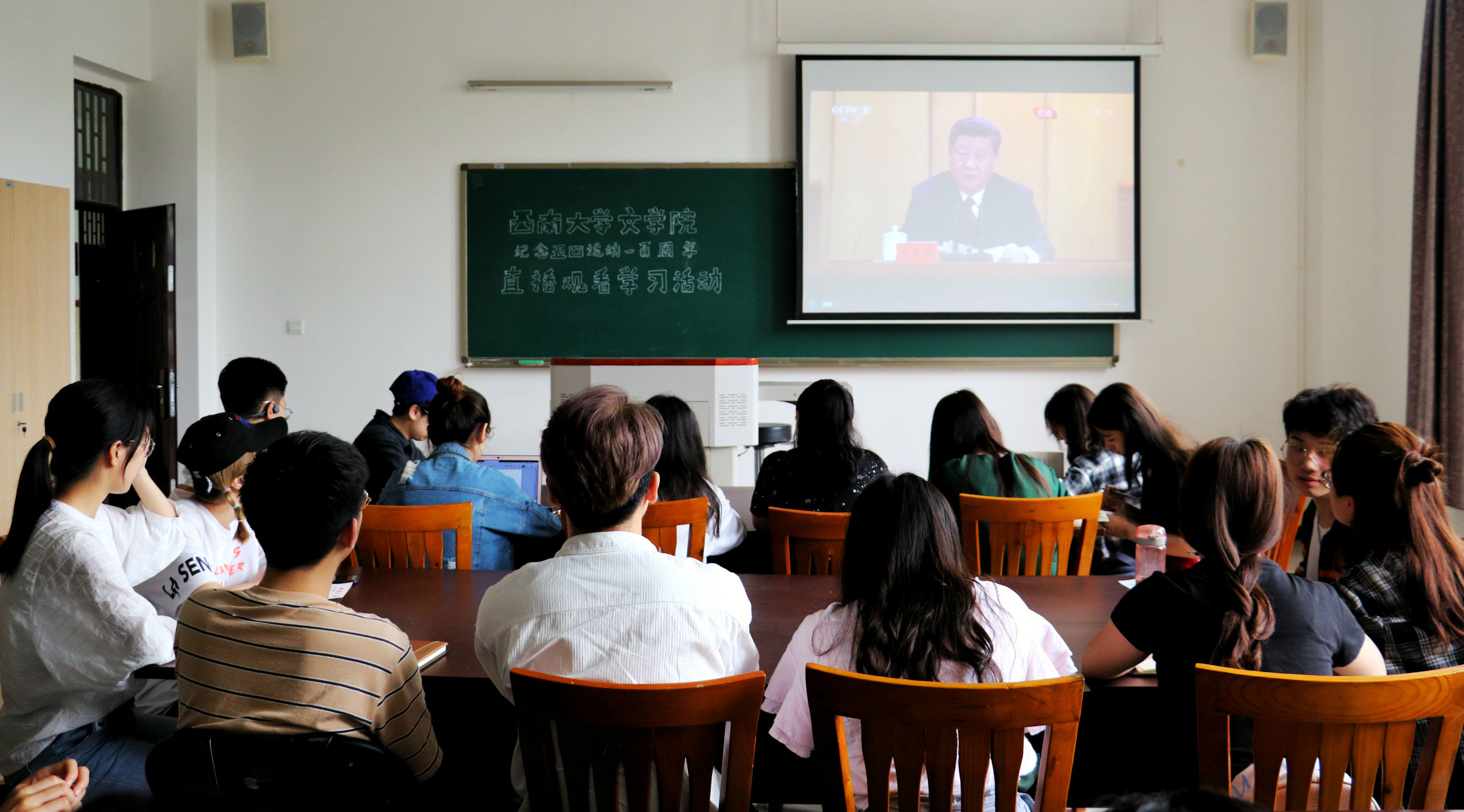 4月30日上午10时30分,纪念五四运动一百周年大会在人民大会堂举行。中共中央总书记、国家主席、中央军委主席习近平出席大会并发表了重要讲话。伟德国际1946304教室举行了观看直播学习活动,伟德国际1946团委员工会部分成员到场观看。