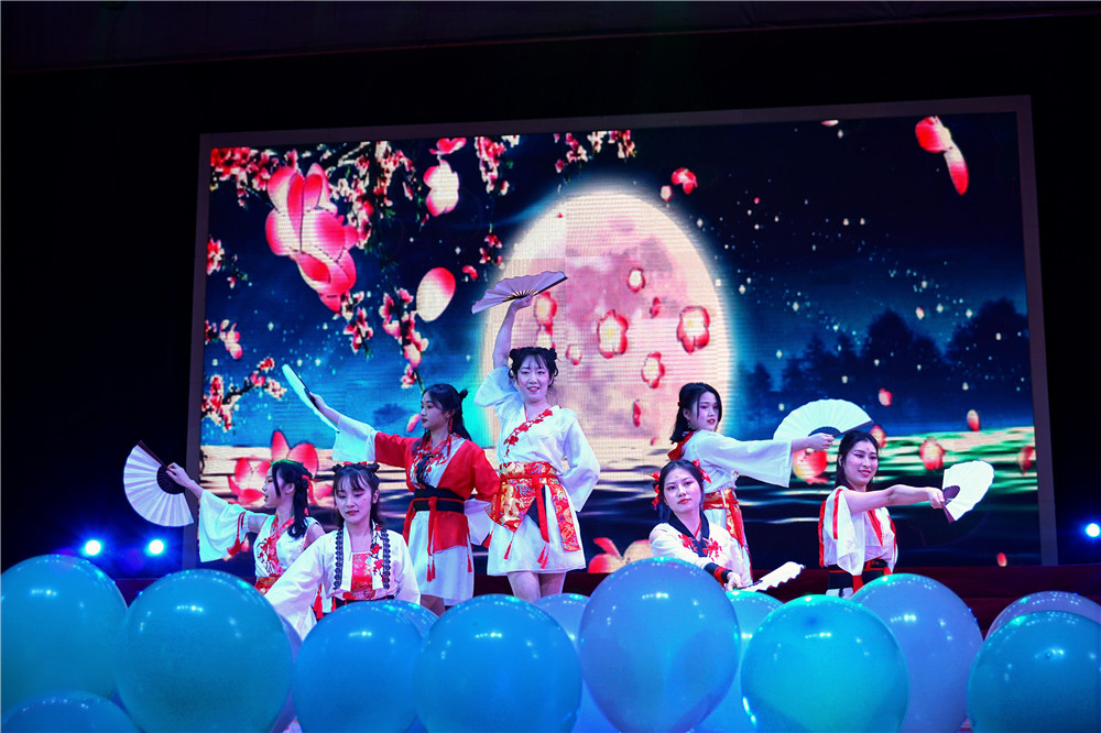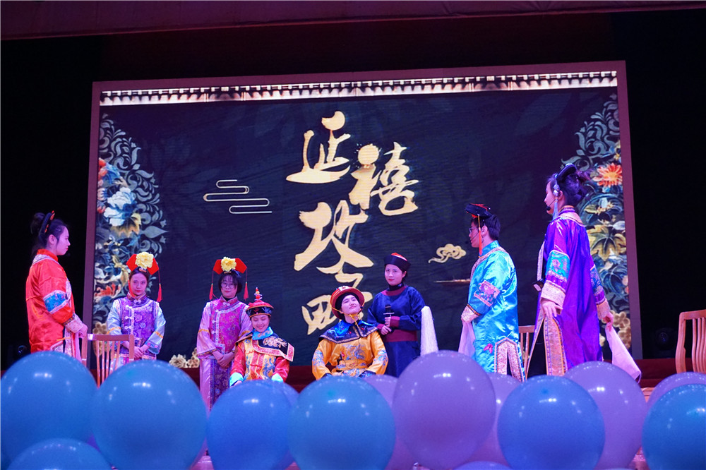 晚会伊始,由各院系同学共同带来的一段爵士舞瞬间点燃了现场的气氛。情景剧《少年有你》以无声的形式讲述着青春的难忘与美好;新编版《延禧攻略》笑点迭出,赢得现场观众的笑声频频;朗诵《伟大的一带一路》由来自不同专业、不同民族的同学用汉、英、法、日和壮族、藏族等语言进行演绎,回顾祖国“一带一路”的发展与奋进,歌颂祖国的繁荣与伟大。