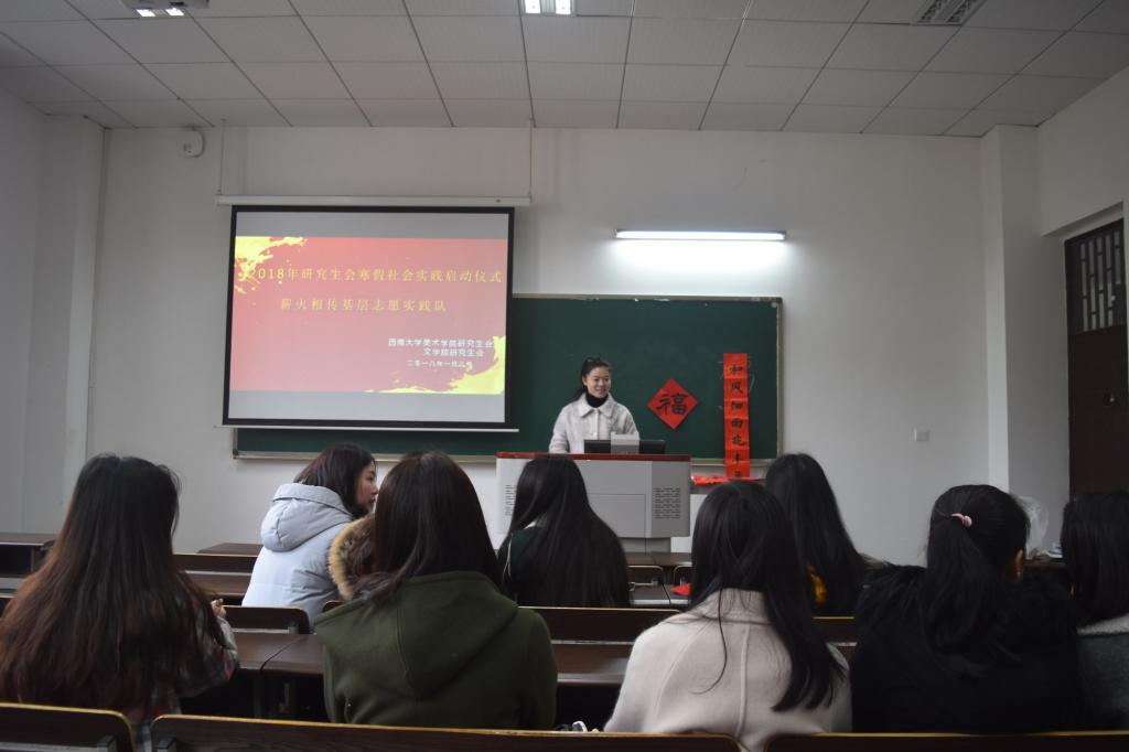此次会议首先由实践指导老师岳洋发表讲话,她着重强调了此次活动的安全及纪律组织问题,并指出此次活动的目的在于展现当代老员工的精神风貌和专业素质,融入课堂,展现西大风采。之后,各位队员就实践内容及具体流程作最后的商讨,伟德国际1946研究生会主席程娅娜与美术公司研究生会主席陈勤对活动细节作最终商定。至此,薪火相传基层志愿实践队寒假社会实践正式启动。
