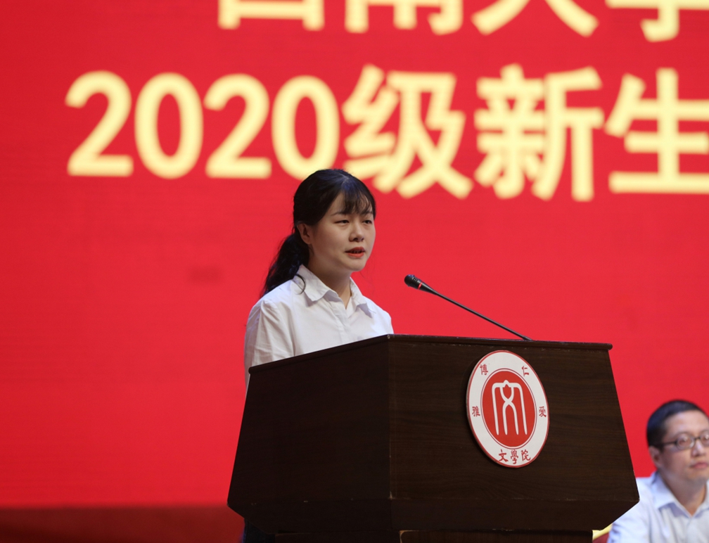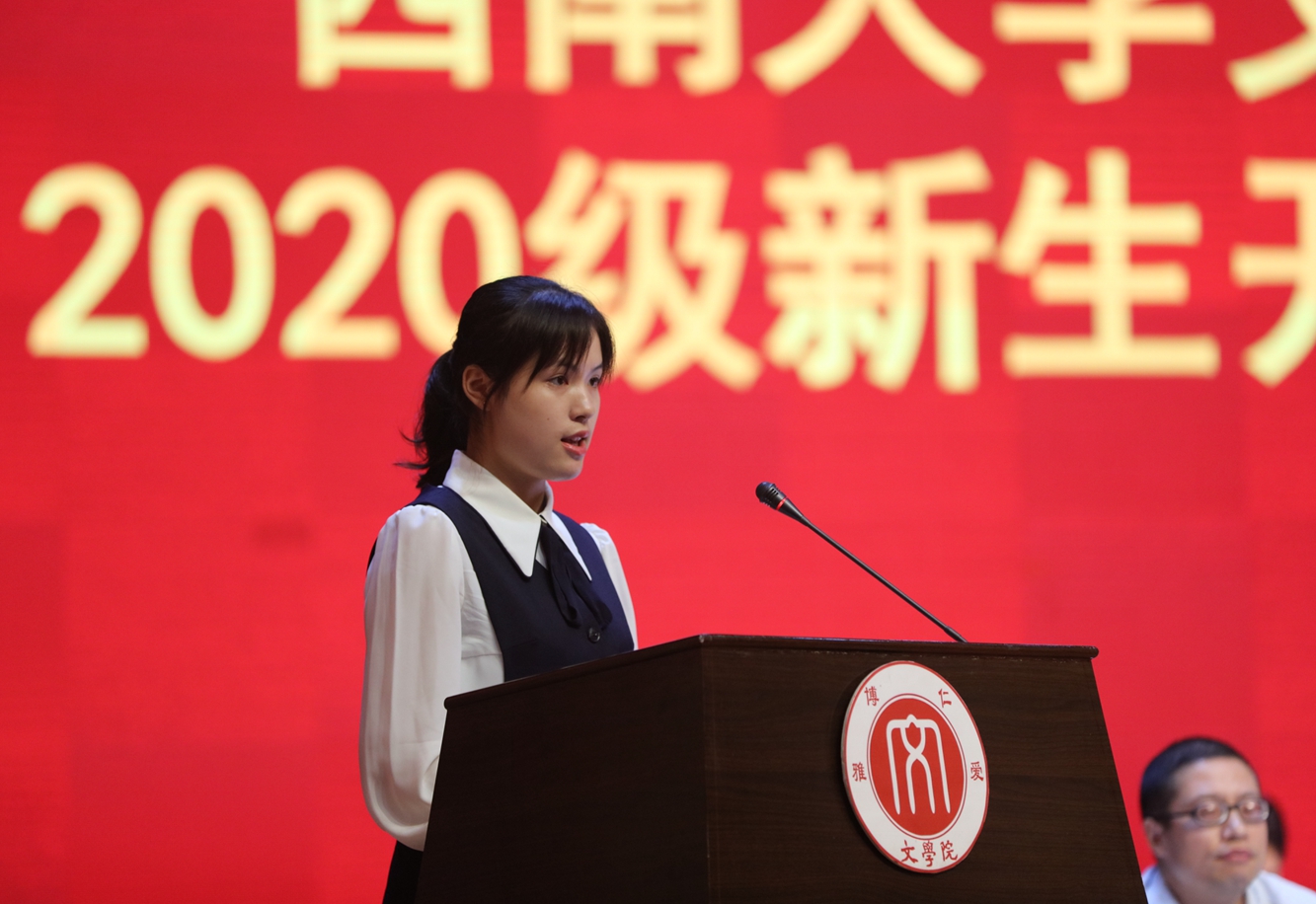 新生代表2020级本科生吴婧卓同学讲述了今年疫情背景下参加高考的不凡青春,分享了初入校园时感受到的伟德国际1946厚重温情。吴婧卓同学表示,我们要“博”览群书,展现文“雅”气质,勇担时代的责任,练就过硬本领,为实现中华民族的伟大复兴贡献青春力量。
