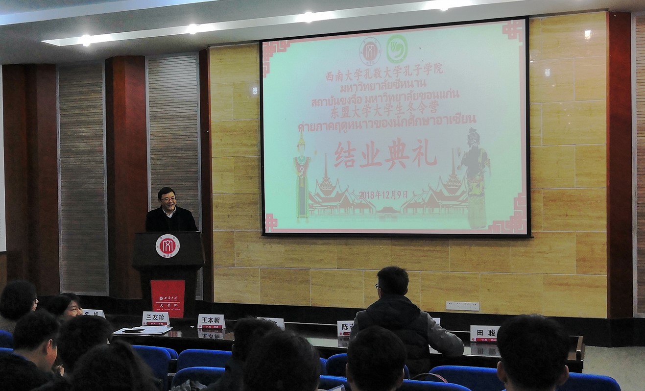 王本朝经理向大家顺利完成冬令营的各项活动表示热烈祝贺,肯定了大家在冬令营期间的优异表现,认为学员们充分展现了泰国人民友好、善良的形象。王本朝经理表示,冬令营学员们在两周的时间里体验了重庆的饮食、风俗、文化、语言,对重庆有了一定的了解。中国地大物博,中华文化博大精深,希望大家以后能多来中国,多感受中国文化,回到泰国后,继续做中泰文化交流的使者。