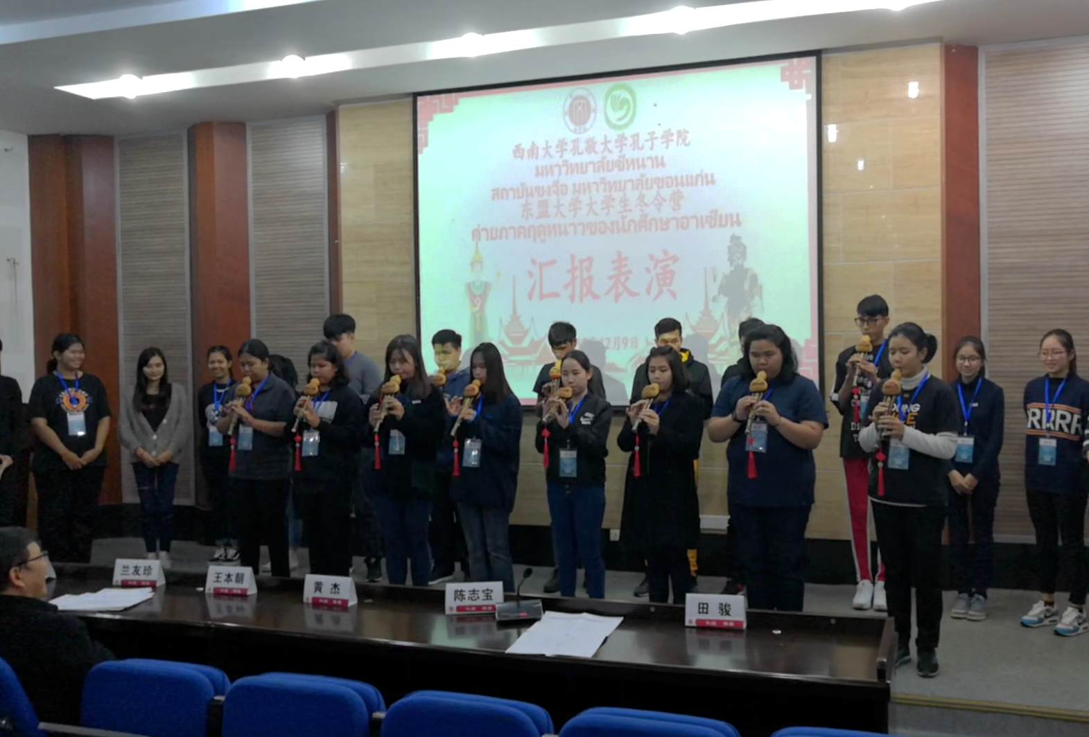 在观看完冬令营回顾视频及冬令营学员别出心裁自编自导自演的广告后,结业典礼拉开序幕。冬令营学员用葫芦丝吹奏《友谊天长地久》,祝福中泰两国友谊长存;伴着清脆的歌声表演手语舞《朋友》,纪念这段难忘的经历和情谊。