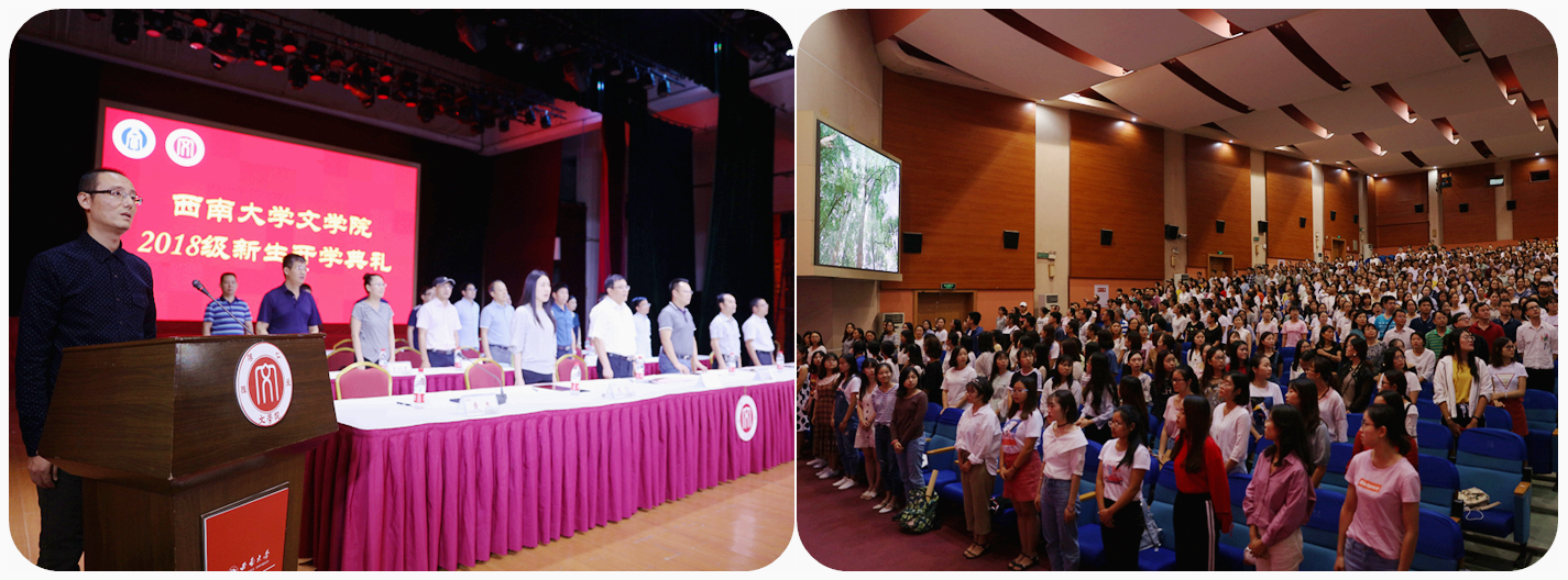 新生代表2018级本科生孙澜僖同学在典礼上发言,孙澜僖同学倡导大家把握机遇,珍惜时光;继承优秀的文学传统,探寻更为深奥的文学境界,以崭新的面貌和振奋的精神迎接新的挑战。