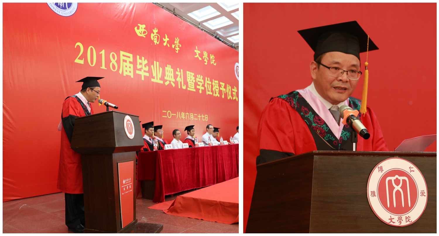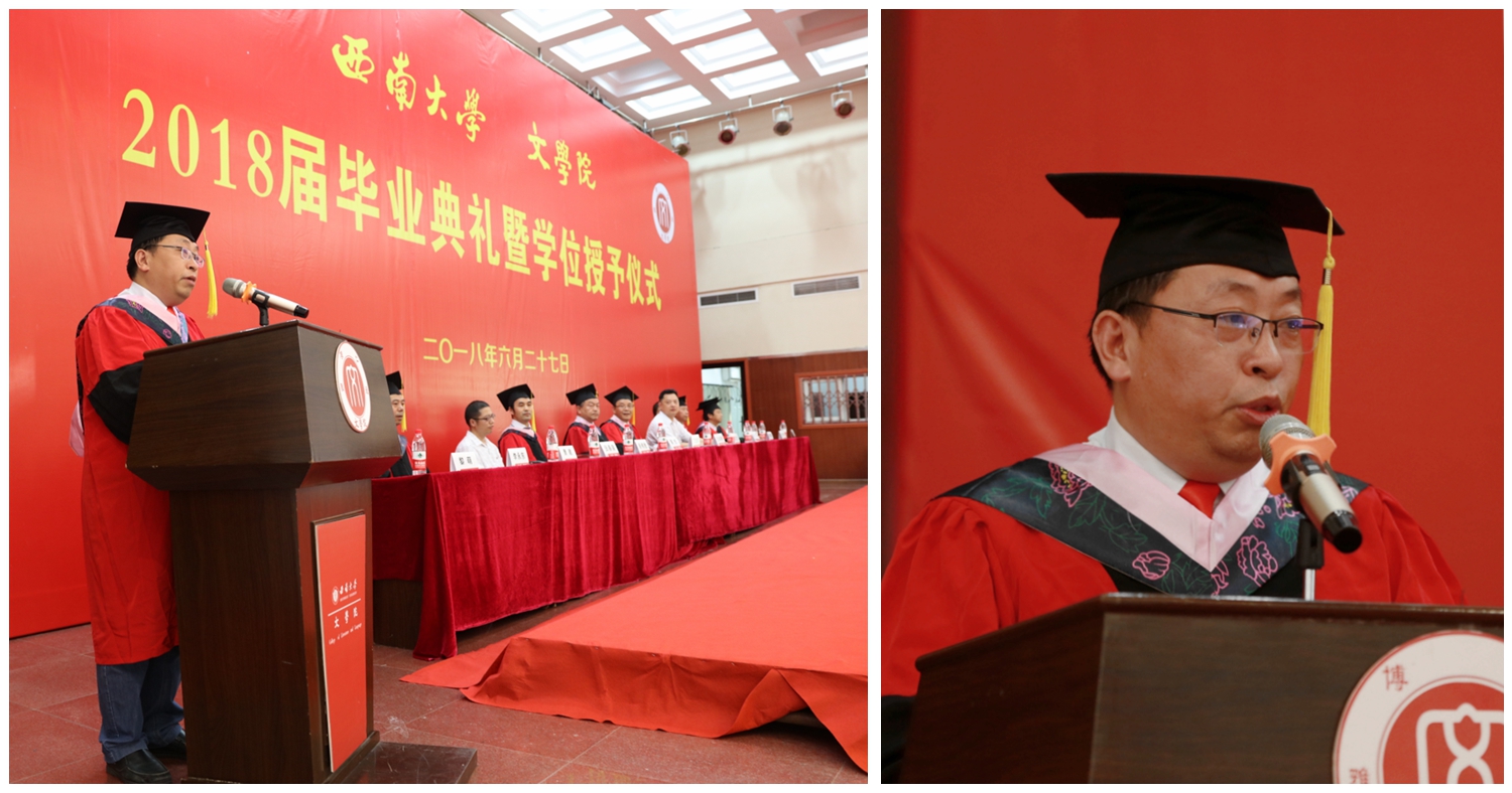 毕业本科生代表、14级汉语言文学师范专业张鹏,毕业研究生代表、2015级中国现当代文学专业危明星分别发言。张鹏同学在校期间,在全国中文核心期刊《中学语文教学》发表教学设计《学学讲道理》,斩获教育部“网络文明,你我同行”主题辩论赛全国总冠军、长安福特杯 2016中国高校汽车辩论赛年度总决赛冠军、第八届全国中华辩论联赛A级赛亚军,获得国家级奖项3个,省区级奖项5个,校级奖励十余项,所策划的微党课获得2017年教育部“全国高校”两学一做支部风采活动微党课特色作品。危明星同学回顾了自己在伟德国际19467年时间的成长,并分享了自己在研究生生涯的两点最大感受:一是要笃定,坚定求学方向,敢走清修之路:二是要踏实,一点一滴积累,日复一日思考。