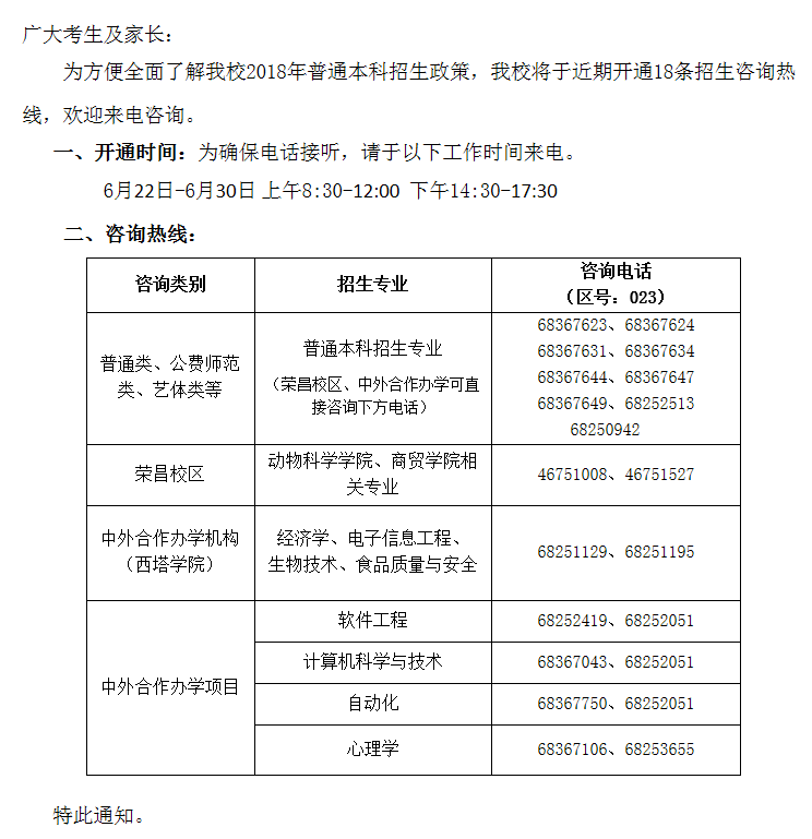 关于公布伟德BV1946官网2018年普通高考招生咨询电话的通知
