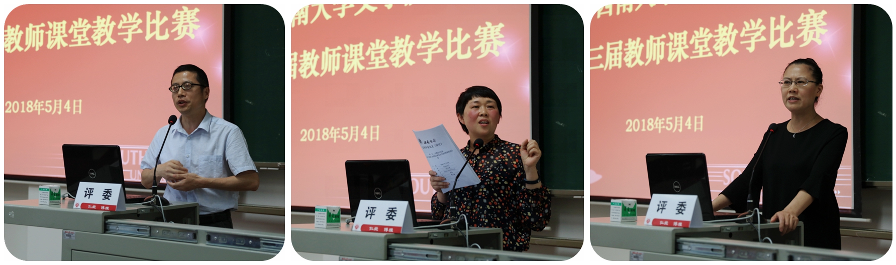 首先上场的是张冰老师,她所讲授的课程是《文艺批评的标准》并从文艺批评的标准是文艺批评的核心切入,从政治标准、艺术标准、思想标准几个方面讲解了文学批评标准的当代变迁。邝明艳老师带来课程《翻译研究》,通过翻译实践和翻译研究的区别点出翻译文学的价值所在并通过从比较文学的观点“翻译研究是技术还是艺术”发问,指出翻译是一门艺术。张纯静老师参赛课程《应用文写作》,通过鲜明生动的举例,清晰凝练的介绍了应用文在日常生活中的直接实用价值。刘洁老师带来课程《三国演义的悲剧意蕴与正统主题》,课程由一曲《临江仙》进入主题,通过分析史料记载讲解了《三国演义》中蜀魏正统倾向的体现,从历史层面和民间层面道出《三国演义》宿命式悲剧的结局。王小惠老师通过文本细读的方式分析了老舍作品《离婚》中的人物形象,层层深入,循序善诱的讲课方式使整节课连贯流畅,生动精彩。