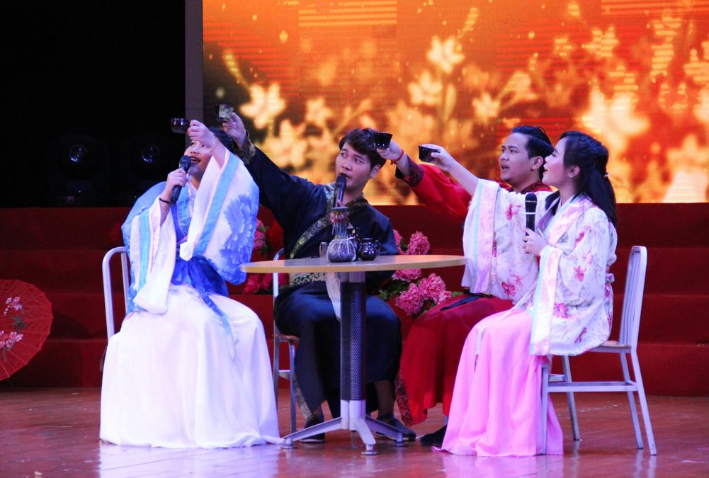 灯光暗下,晚会正式开始;《初见泰国》舞蹈为晚会开幕,点燃了现场观众的热情。随后,中泰走秀《春服既成》在轻快的音乐中展示了中泰两民族的华丽服装,令观众们大饱眼福,现场欢呼不断,掌声连连。小合唱《世界上的另一个我》、中泰对唱《春暖花开》和合唱《情非得已》唱出了同学们真挚的情感;情景剧《师说》、爵士舞《so cute》和舞蹈《神奇的土地》更是表达了中泰青年的热忱和永恒的情谊并将晚会推向高潮。