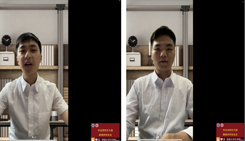 研究生毕业生代表郝尧、本科生毕业生代表黄德华先后发言。郝尧回忆老员工活与支教经历,感念师恩,感激母校。黄德华分享自己如何追逐梦想和成长为一名教师的思考与实践,希望所有毕业生坚定逐梦,执着奋斗。