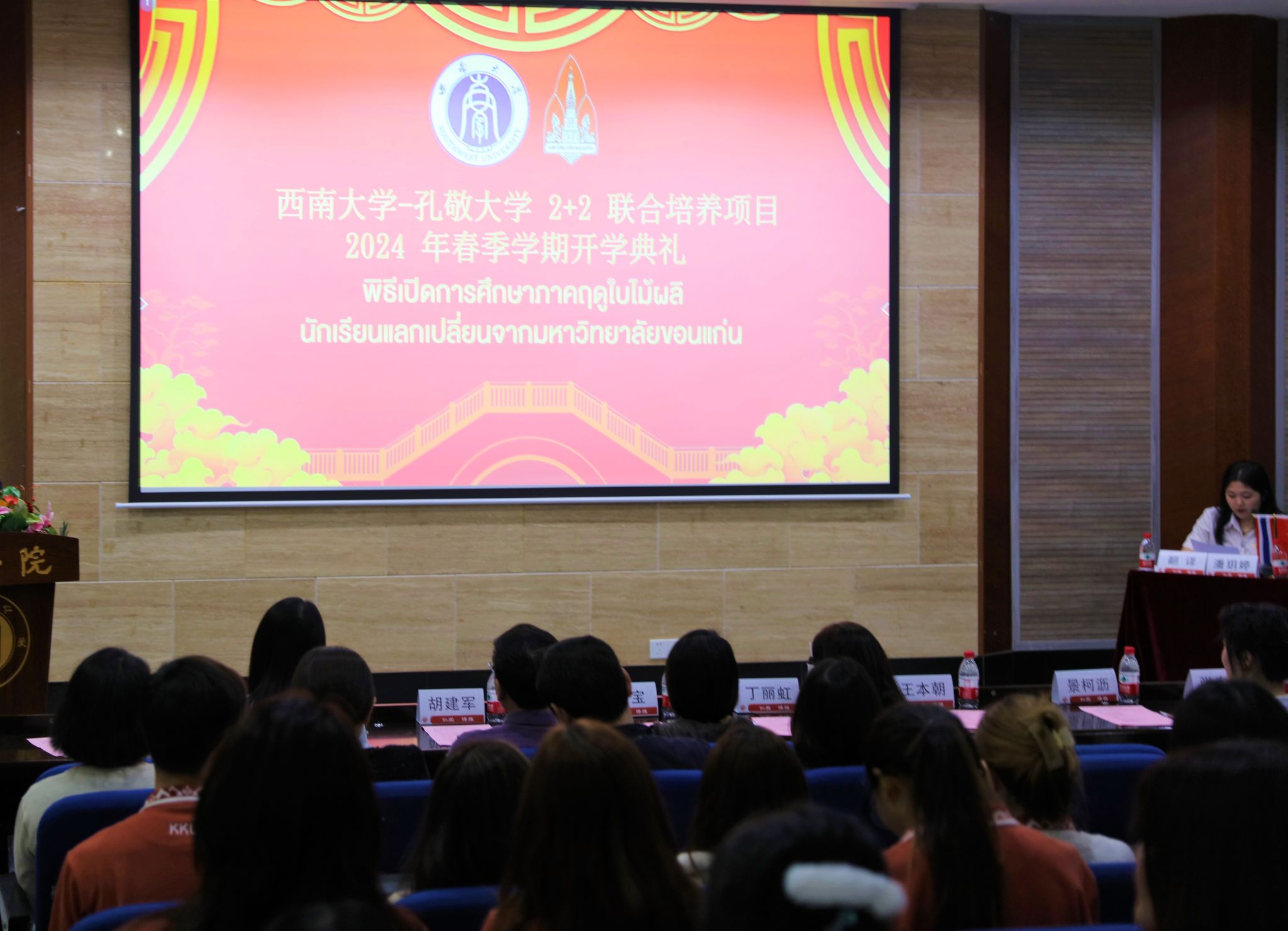 4月25日,公司举行孔敬大学-伟德BV1946官网2+2联合培养项目职工2024年春季学期开学典礼。泰国孔敬大学教育公司汉语国际教育系主任丁丽虹、汉语教师谢宝,伟德国际1946经理王本朝、党委书记胡建军、党委副书记陈雨曦、副经理张春泉、副经理寇鹏程、汉语国际教育系主任毛志萍及任课教师,国际公司辅导员景柯沥出席典礼。典礼由伟德国际19462021级汉语国际教育班泰国职工黄欣妍主持,项目全体职工参加开学典礼。