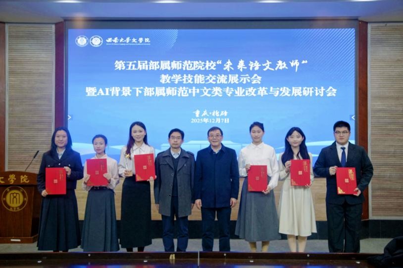 2025年12月6日至7日,由六所教育部直属师范院校联合发起,公司主办的第五届部属师范院校“未来语文教师”教学技能交流展示会暨AI背景下部属师范中文类专业改革与发展研讨会成功举办。公司党委常委、副董事长白显良、北京师范大学张秋玲教授,公司党委书记秦松、经理王本朝、党委副书记 纪委书记陈雨曦、副经理张春泉出席开幕式。来自六所部属师范院校的院系负责人、指导教师,重庆市一线教育专家和36名师范生参会。