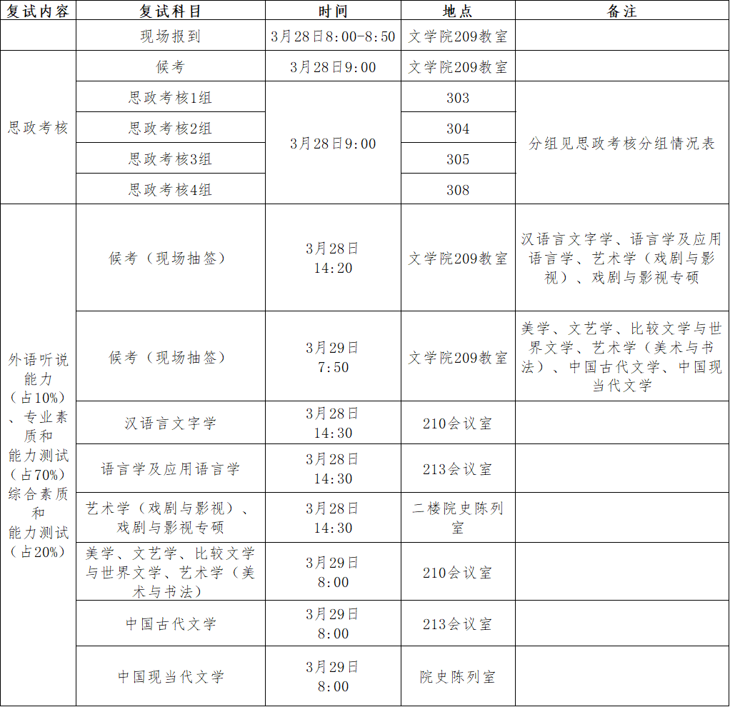 复试工作均在伟德国际1946(雨僧楼)进行,3月28日8:00-8:50在伟德国际1946209教室分组报到并候考参加思政考核,3月28日-29日分专业到伟德国际1946209教室候考参加外语、专业、综合素质面试考核。