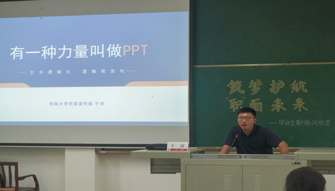 于涛首先对PPT制作进行细致介绍,随后为同学们具体梳理适用于工作汇报、路演等应用场景的PPT制作步骤。他以PPT制作的简洁性、美观性、板块性为基点,现场演示PPT的制作流程、具体分析PPT制作过程中的盲区误区,并以PPT观看者的角度对PPT内容设计中图标选用、文本设计、内容组合排版等进行点评指导。最后,于涛对毕业生未来职业发展表示诚挚祝福。